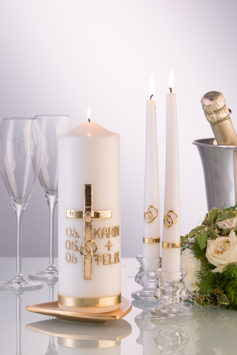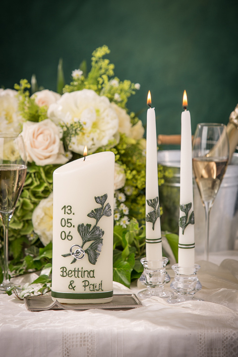 Die Beschriftung unserer Hochzeitskerzen mit zwei Namen und einem Datum ist im Preis bereits inbegriffen.