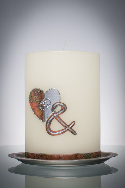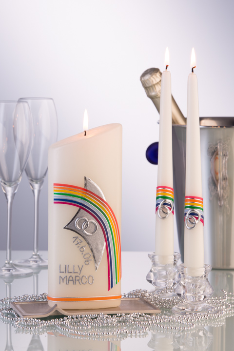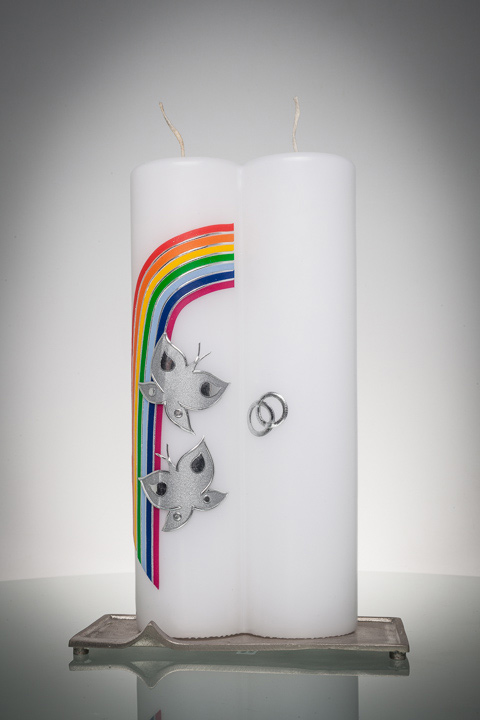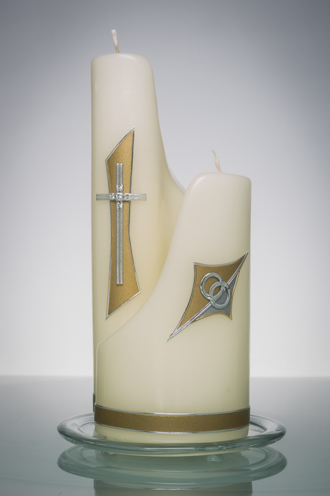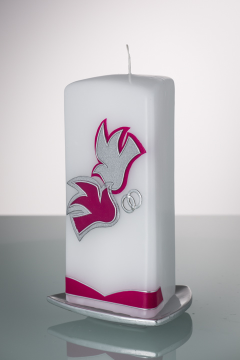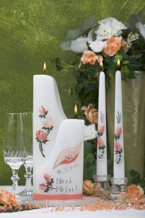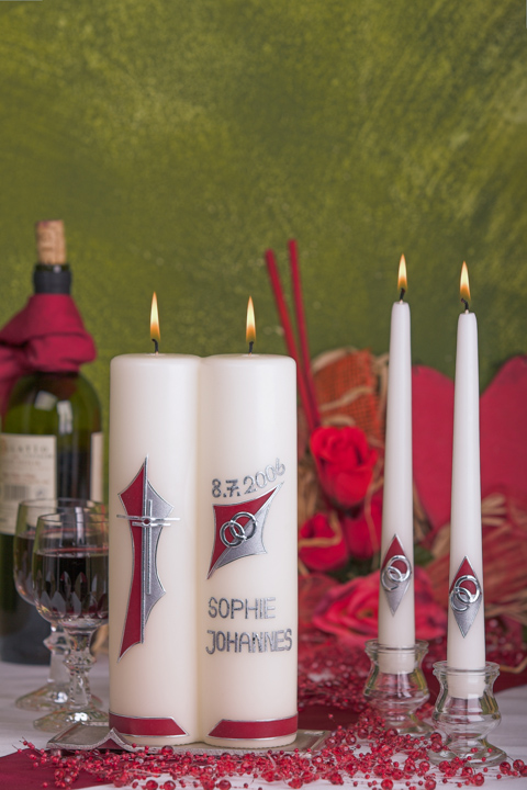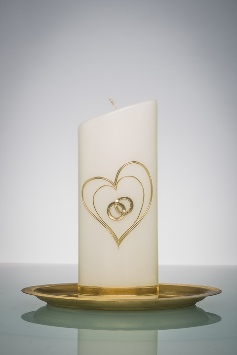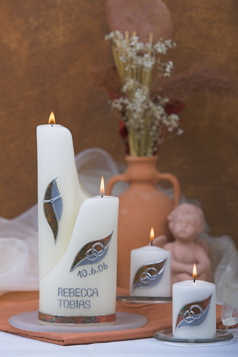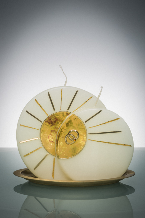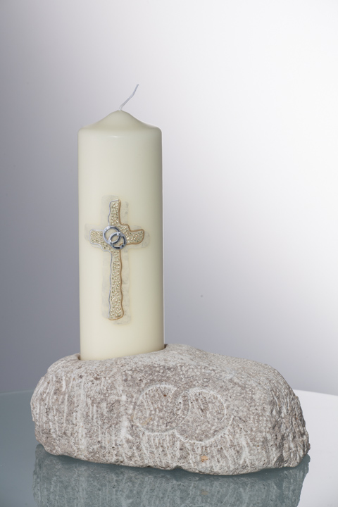 Der Kerzenständer (270 x 100 x 160 mm) ist von einem Bildhauer aus Muschelkalk von Hand gehauen. Er trägt als Motiv zwei handgravierte Ringe. Nach der Trauung ist das Kerzenensemble ein außergewöhnliches Dekorationsobjekt in der gemeinsamen Wohnung.